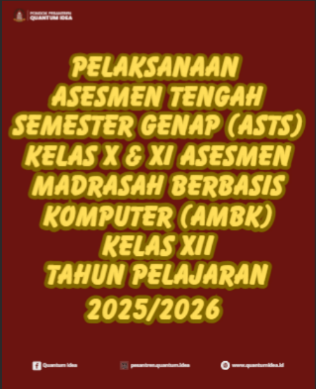 Alhamdulillah, Pondok Pesantren Quantum Idea telah sukses menyelenggarakan Asesmen Tengah Semester Genap (ASTS) untuk peserta didik Kelas X dan XI, serta Asesmen Madrasah Berbasis Komputer (AMBK) untuk Kelas XII pada Tahun Pelajaran 2025/2026.